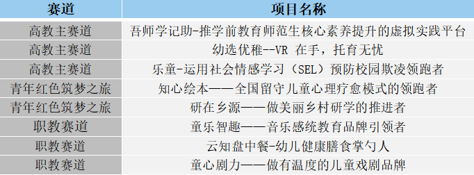 有秉持“知心童行”理念,永怀童心,知心相随,致力于领跑全国留守儿童心理疗愈模式的“知心绘本”。有以弘扬并传承中华传统戏剧文化为初心,做有温度的儿童戏剧品牌的“童心剧力”。有立志做幼儿健康膳食的掌勺人的“云知盘中餐”,还有以助推学前教育师范生核心素养提升为理念,欲创建虚拟实践平台的“吾师•学记”,“童乐智趣”——音乐感教统教育品牌的引领者等等优秀项目。