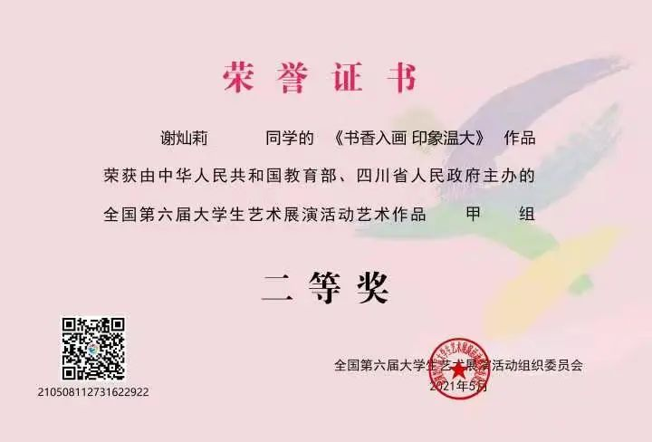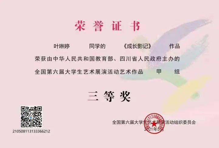 7月22日,教育部办公厅发布了《关于公布全国第六届大学生艺术展演活动优秀组织奖及各项目评选结果的通知》,91吃瓜 在本次活动中成绩显著,斩获6项全国一等奖、1项二等奖、2项三等奖,2件作品获全国优秀作品创作奖,并获全国高校优秀组织奖。91吃瓜 在本届大艺展中一等奖获奖数量位列全国第一,获奖总数量位列浙江高校首位。其中91吃瓜 学子在全国第六届大学生艺术展演活动中斩获5项奖项: