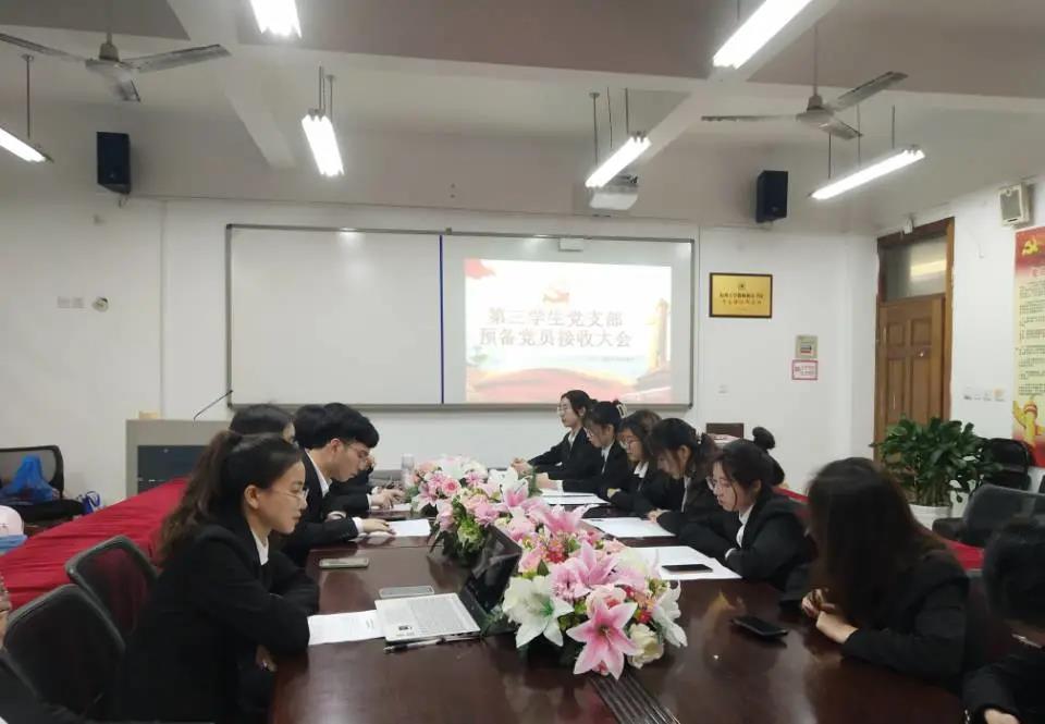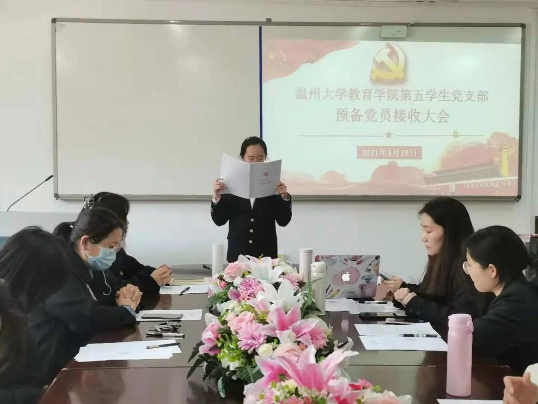 2021年3月19日,第五学生党支部中共预备党员接收大会在91吃瓜 党员之家举行,会议由周晨霏同志主持,该支部全体党员参与此次会议。经党支部大会决议,一致同意接收汤美萍、王亭亭、曹嘉芮、李柠、蔡婷美5名同志成为中共预备党员。