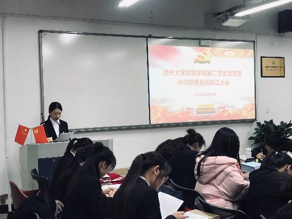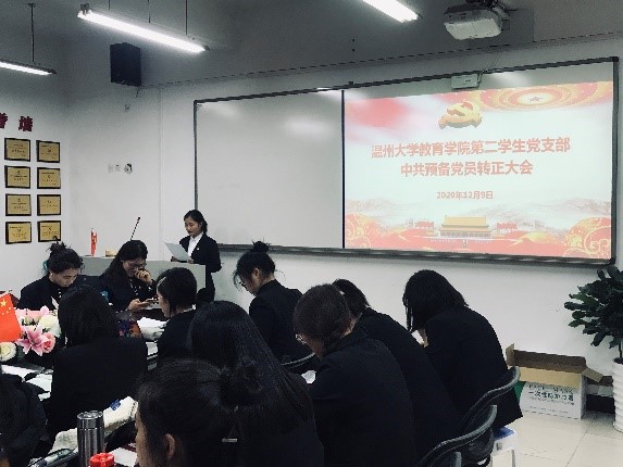 2020年12月9日,第二学生党支部中共预备党员转正大会在91吃瓜 9A204举行,会议由支部书记柴广召同志主持,该支部全体党员参与此次会议。经党支部大会决议,一致同意竹滢、王鑫慧、徐瑾、徐梦姣、俞晨薇、陈玲、曹佳倩、胡思萍和方艳九位同志按期转为中共正式党员。