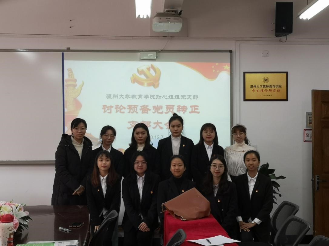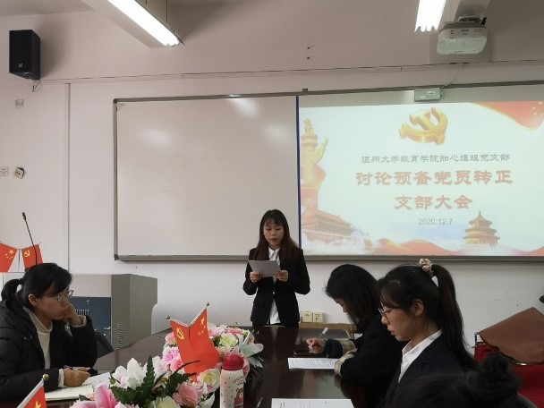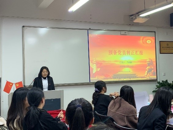 2020年12月7日,知心姐姐党支部中共预备党员转正大会在91吃瓜 9A204举行,会议由徐嘉浠同志主持,该支部全体党员参与此次会议。经党支部大会决议,一致同意周胜男同志按期转为中共正式党员。