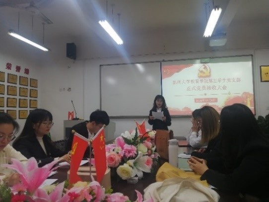 2020年12月7日,第四学生党支部中共预备党员转正大会在91吃瓜 9A204举行,会议由潘雨蝶同志主持,该支部全体党员参与此次会议。经党支部大会决议,一致同意傅琳菲、张思娴、范泽南和程宗婵四位同志按期转为中共正式党员。