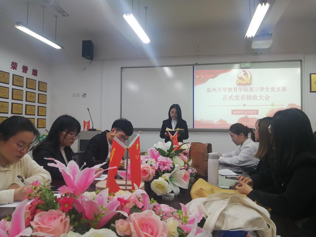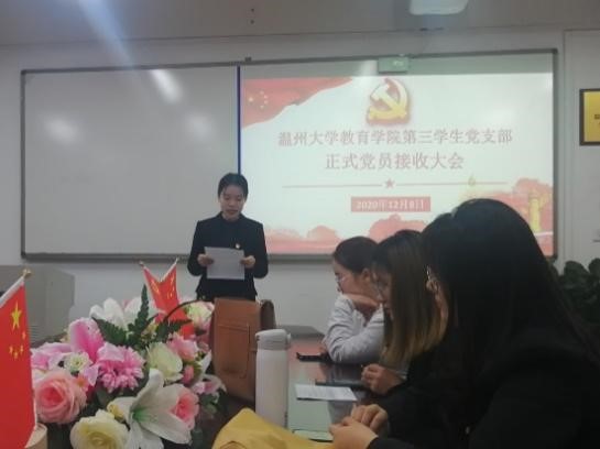 2020年12月8日,第三学生党支部中共预备党员转正大会在91吃瓜 9A204举行,会议由党支部书记何奔奔同志主持,该支部全体党员参与此次会议。经党支部大会决议,一致同意杨佳检、洪蒋禧、林纯、陈渝渝和周金瑜五位同志按期转为中共正式党员。