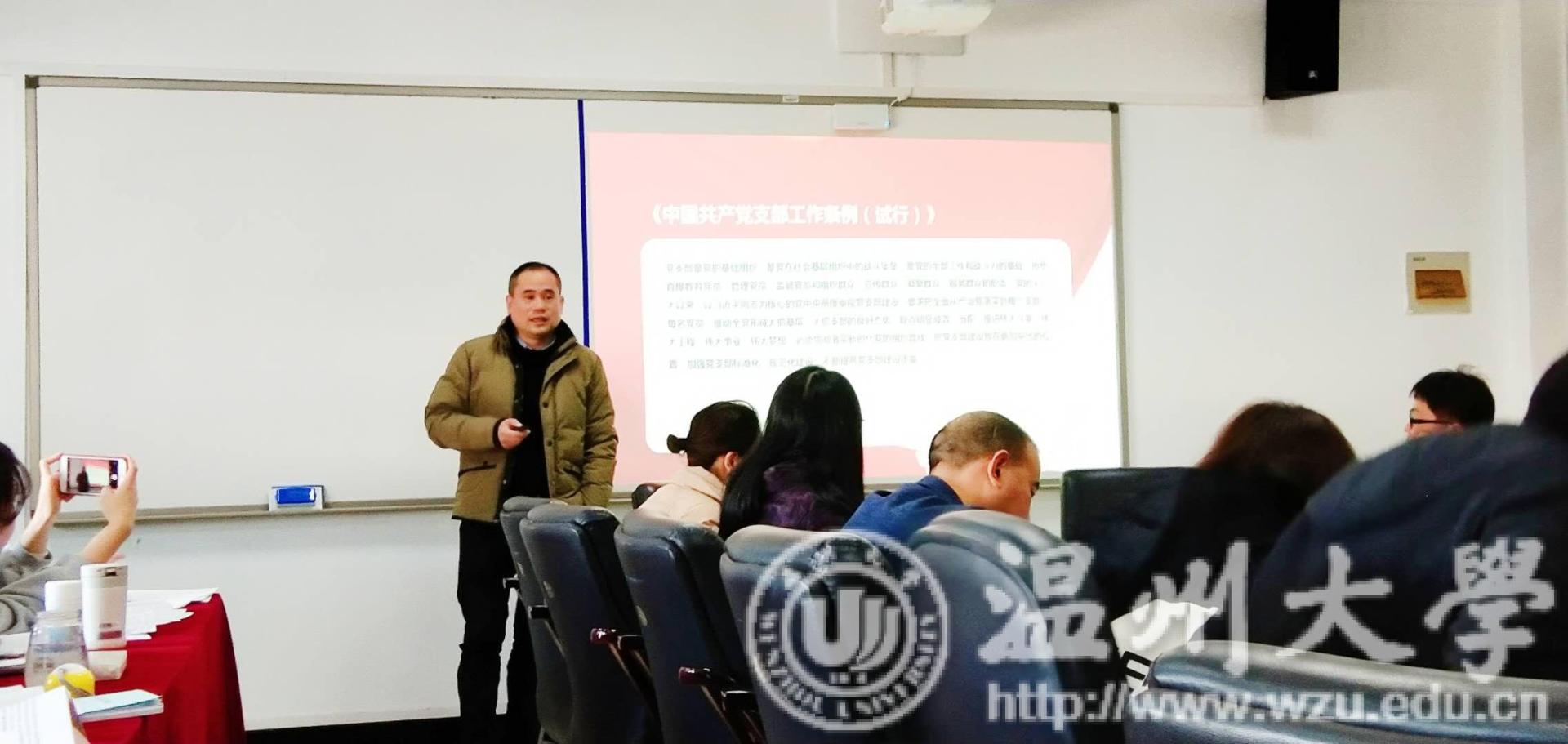 杨立淮书记围绕“牢固树立党的一切工作到支部的鲜明导向”这一主题,从党的领导人论党支部建设、历史的考察、时代的课题、时代的责任四个方面出发,带领参会的四个党支部的师生党员集中解读学习《中国共产党支部工作条例(试行)》。杨立淮书记告诉大家,高度重视并强调党支部的地位和作用,既是马克思主义政党建设的突出特点,也是中国共产党的一大优良传统和政治优势。从毛泽东同志、邓小平同志、江泽民同志再到胡锦涛同志、习近平同志,无不强调基层党组织和党支部建设的重要性以及要发挥基层党组织的坚强战斗堡垒作用。纵观党的历史,党所取得的一切成就,都与千千万万个党支部坚强有力的支撑是密不可分的。从新民主主义革命到社会主义革命和建设这段历史时期的考察,我们可以发现要从战略和全局高度成分认识党支部的重要地位和功能,更好地发挥战斗堡垒作用,坚持围绕中心、服务大局不动摇,不断推进实践创新、理论创新和制度创新。杨立淮书记引经据典、结合当代,强调了从十八大以来,推进全面从严治党向纵深发展,必须树立党的一切工作到支部的鲜明导向,这就是要夯实“一个基础”,即党支部是党最基本的组织,是党的全部工作和战斗力的基础;强化“两个功能”,即党支部的政治功能和服务功能;确保“三个落到”,即把思想政治工作落到支部、把从严教育管理党员落到支部、把群众工作落到支部。本条例共8章37条,以习近平新时代中国特色社会主义思想为指导,贯彻党章要求,落实新时代党的组织路线,既发扬我们党长期积累的党支部建设宝贵传统,又体现党的十八大以来基层创造的好做法好经验,规定明确、内容全面,具有很强的指导性和时代性。了解学习完条例相关内容以后,杨立淮书记引用人民日报评论员文章作总结,告诉大家:九层之台,起于累土,党支部是党的基础组织,是党的全部工作和战斗力的基础;要让党支部在基层工作中唱主角;要加强党支部标准化、规范化建设;欲筑室者,先治其基。《条例》对党委(党组)和党组织书记抓党支部建设一一作出规定,既赋了权,也明了责。
