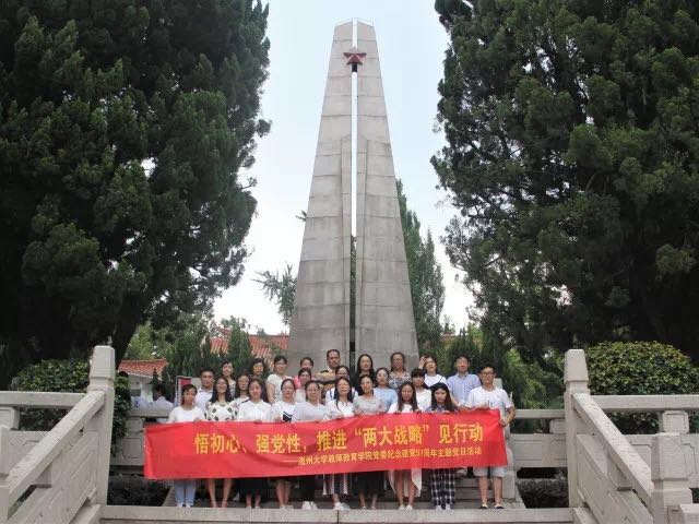 2018年6月29日下午,教师91吃瓜 组织师生党员赶赴江心屿,开展“悟初心、强党性,推进‘两大战略’见行动”的主题党日活动。在江心屿革命烈士纪念碑前,教工党员潘士杰与学生党员张乐代表学院为革命烈士献上花圈,在场党员同志默哀并鞠躬,表达对革命先烈的缅怀之情。在鲜红的党旗下,聂海燕同志带领各位党员同志重温入党誓词。学生党员阮郑醒、周文带领大家一起学习了毛泽东同志的《为人民服务》与习近平同志的《用党员的标准严格要求自己》两篇文章。学院党委书记杨立淮在革命烈士纪念碑前发表了讲话,他结合这两篇文章的学习指出,学院党组织和党员要始终牢记全心全意为人民服务的宗旨,在推进事业发展中要发挥好基层党组织战斗堡垒作用和党员先锋模范作用。最后,党员同志们在解说员的带领下参观革命纪念馆。党员同志们纷纷表示,应该继承先烈遗志,发扬革命传统,坚定理想信念,不忘初心,为党的事业奋斗。