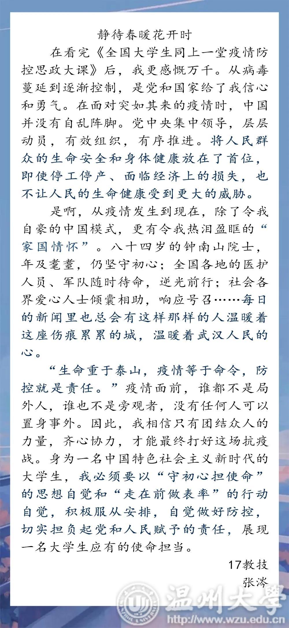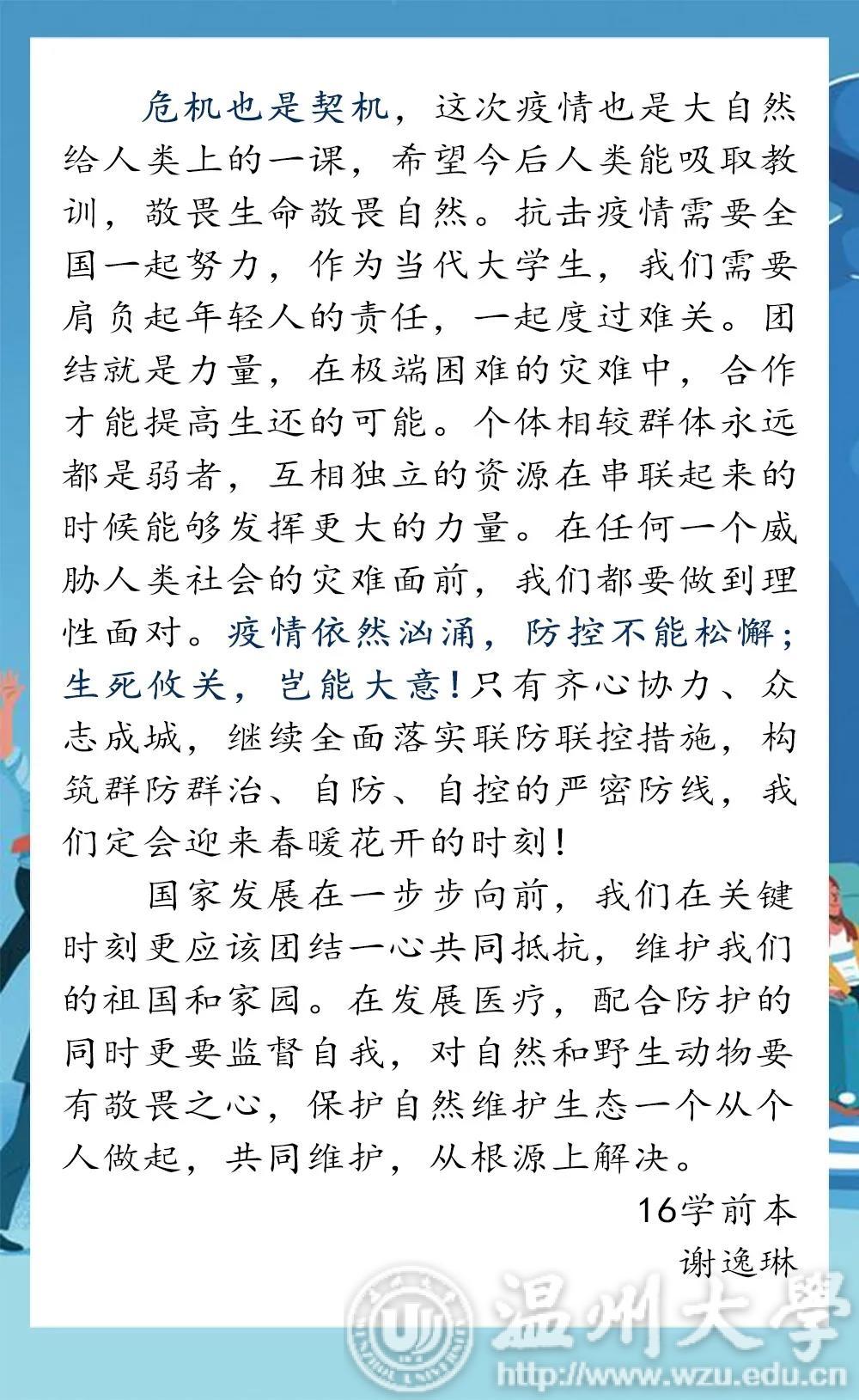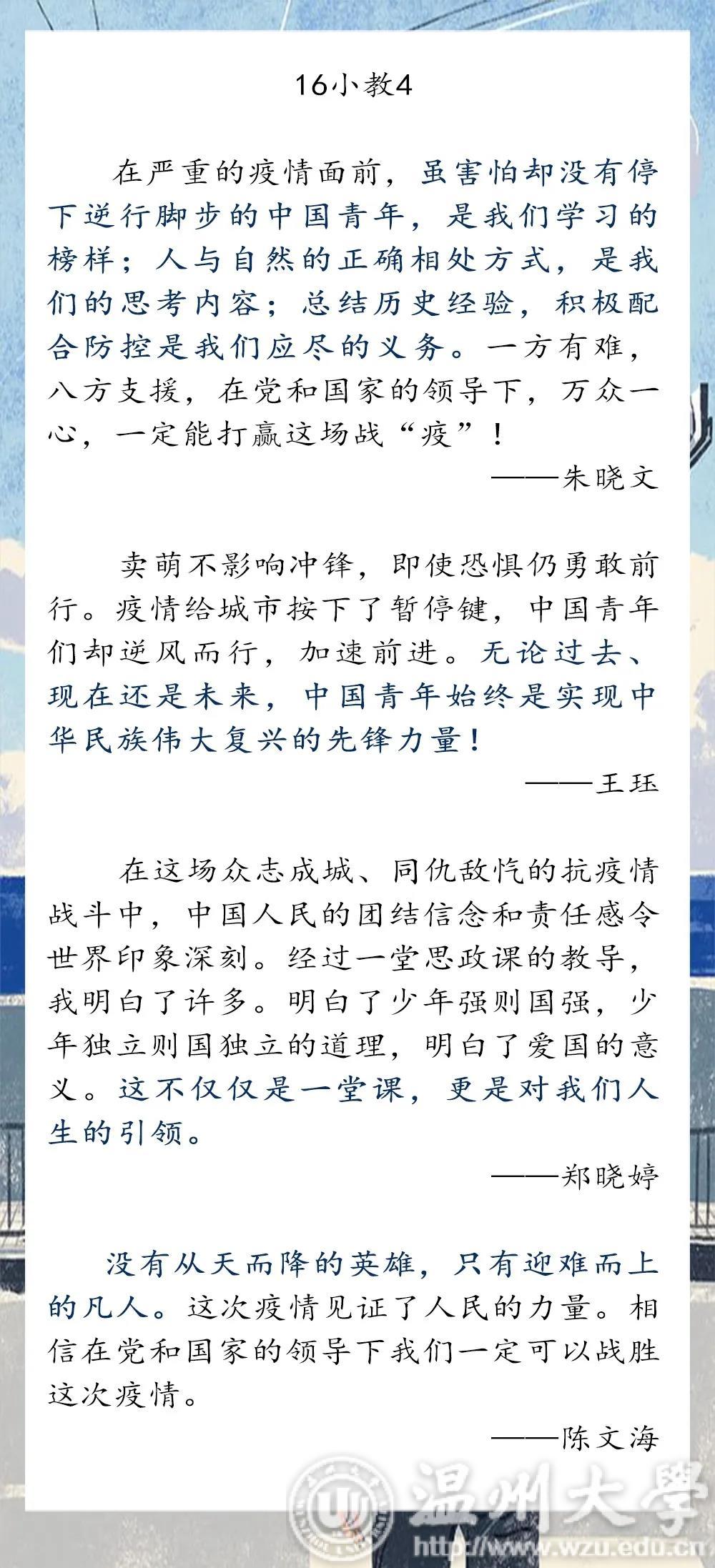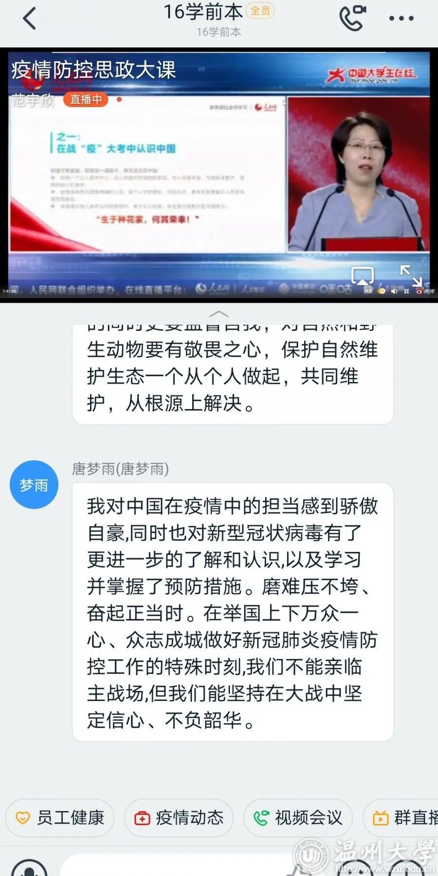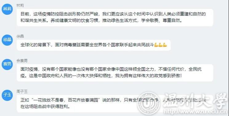 通过收看此次疫情防控思政大课,91吃瓜 学子有体悟,有思考,有收获。从疫情大考到责任与使命,从个人的担当到为国奉献,同学们畅所欲言,交流学习心得,分享自己的感悟和体会。