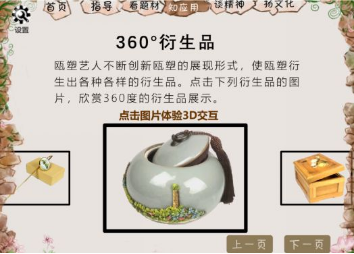 随着大门缓缓打开,你将进入交互式课件《你好,瓯塑》。课件内容包括四个学习单元和一个拓展单元,分别对应初识瓯塑知识、探索瓯塑工艺制作、传承瓯塑技法、弘扬瓯塑文化;而拓展单元VR瓯塑馆,运用VR技术让我们身临其境的感受瓯塑文化。