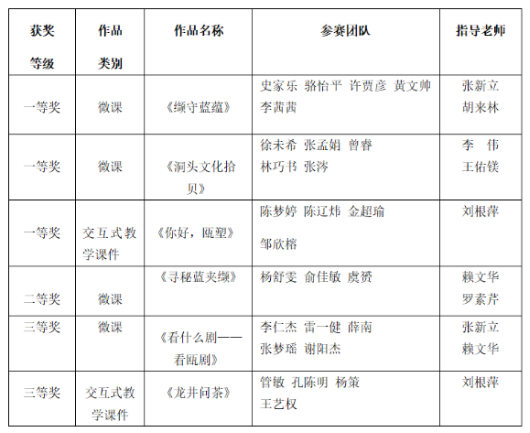 本届竞赛的教育资源类作品的主题是 “乡土文化”,教育技术专业的同学们除了运用所学的专业技术,还充分利用“视觉文化与媒介素养”课程所学的知识和方法,对温州地区的乡土文化进行深入挖掘和创新表达,突显对文化研究的专业能力与优势,同时,体现了较强的信息化教学设计与课程资源设计开发的能力。参赛作品包括四个微课程和两个交互式教学课件,获奖情况如下: