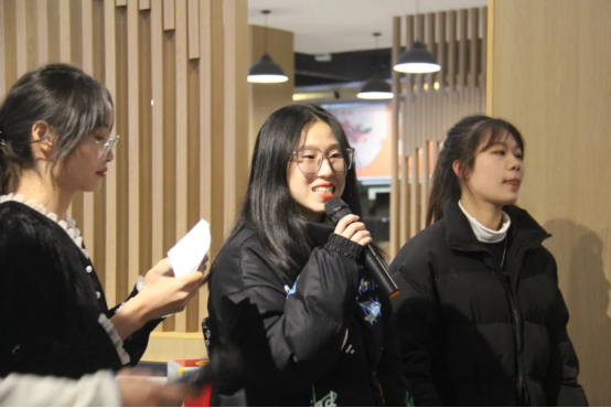 在吃完热腾腾的饺子之后,就进入了游戏环节。首先是抱团游戏,当主持人喊一个数字,大家就立即与临近的同伴按所喊数字抱成一团,没有抱团成功的同学被淘汰出局、接受惩罚。紧张的气氛牵动着在场同学们的心,寻找队友的同时,也建立了彼此之间的联系,拉近了彼此的距离,加深了游戏成员们对于团队的归属感。