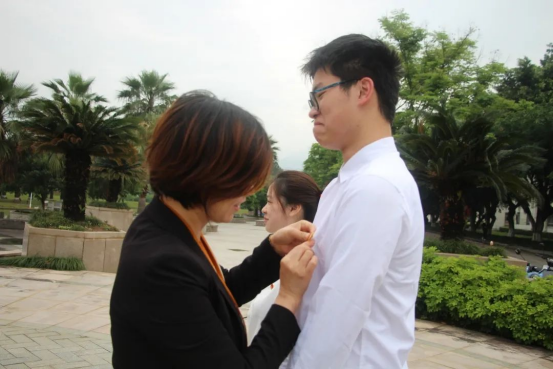 随着激昂壮阔的团歌响起,两位新发展团员迈着整齐的步伐向前一步,转身面向身后的国旗雕塑。彭小媚书记为新团员佩戴团徽,并勉励他们努力学习,积极奉献,争做榜样。