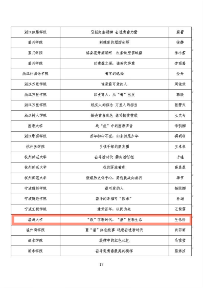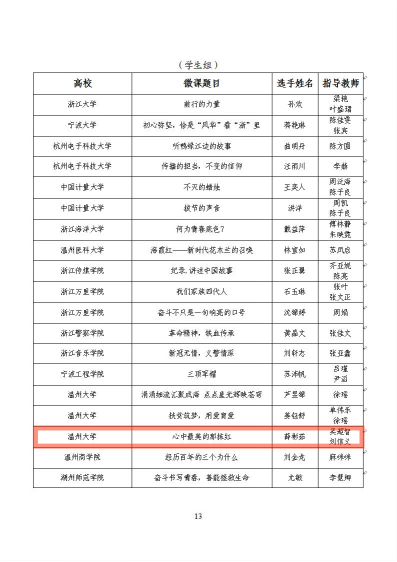 为深入贯彻习近平总书记在学校思想政治理论课教师座谈会上的重要讲话精神,贯彻落实中央、省委关于深化学校思政课改革创新的部署要求,创新打造全链条的思政育人新体系,从而进一步强化对全校青年的政治引领和价值引领,浙江省高校组织思政微课大赛,唱响主旋律、弘扬正能量、传播好声音。在该比赛中91吃瓜 王恬恬老师以《“数”字新时代,“浙”里新生活》荣获2021年度浙江省思政微课比赛(教师组)三等奖,91吃瓜 学子薛彬茹以《心中最美的那抹红》荣获2021年度浙江省思政微课比赛(学生组)二等奖。