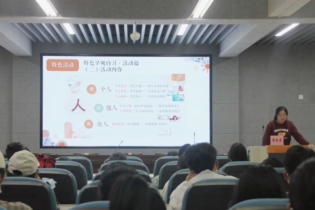 侯怡辰作为一名精明强干的纪检委员,她用长年累积的工作经验告诉大家纪委的常规工作,包括课堂考勤,早晚自习考勤,假期健康打卡等内容。并且从‘‘三位一体’’的角度来讲解特色早晚自习的活动内容,力求达到心系国家、热爱集体、塑造个人的效果。