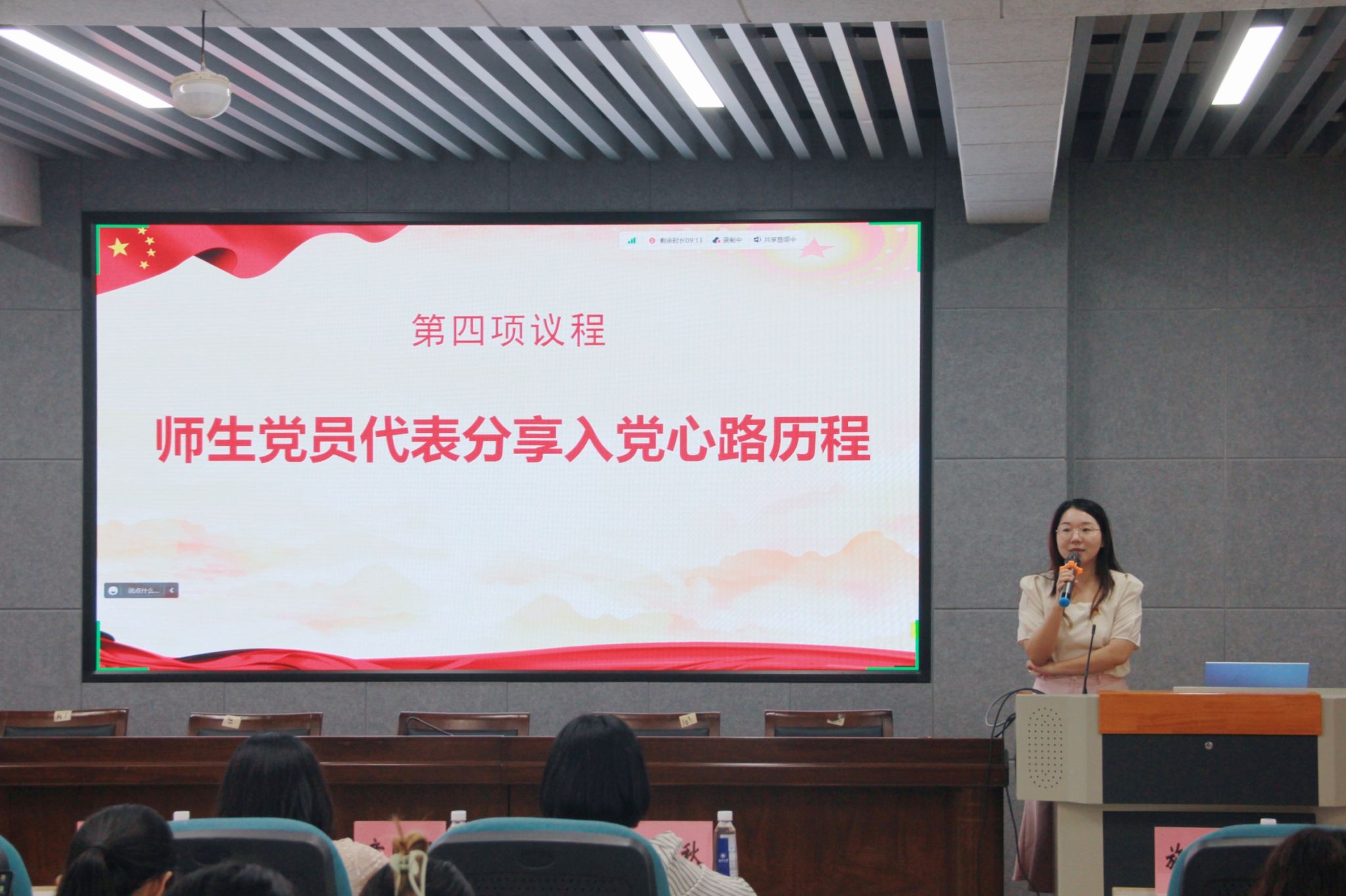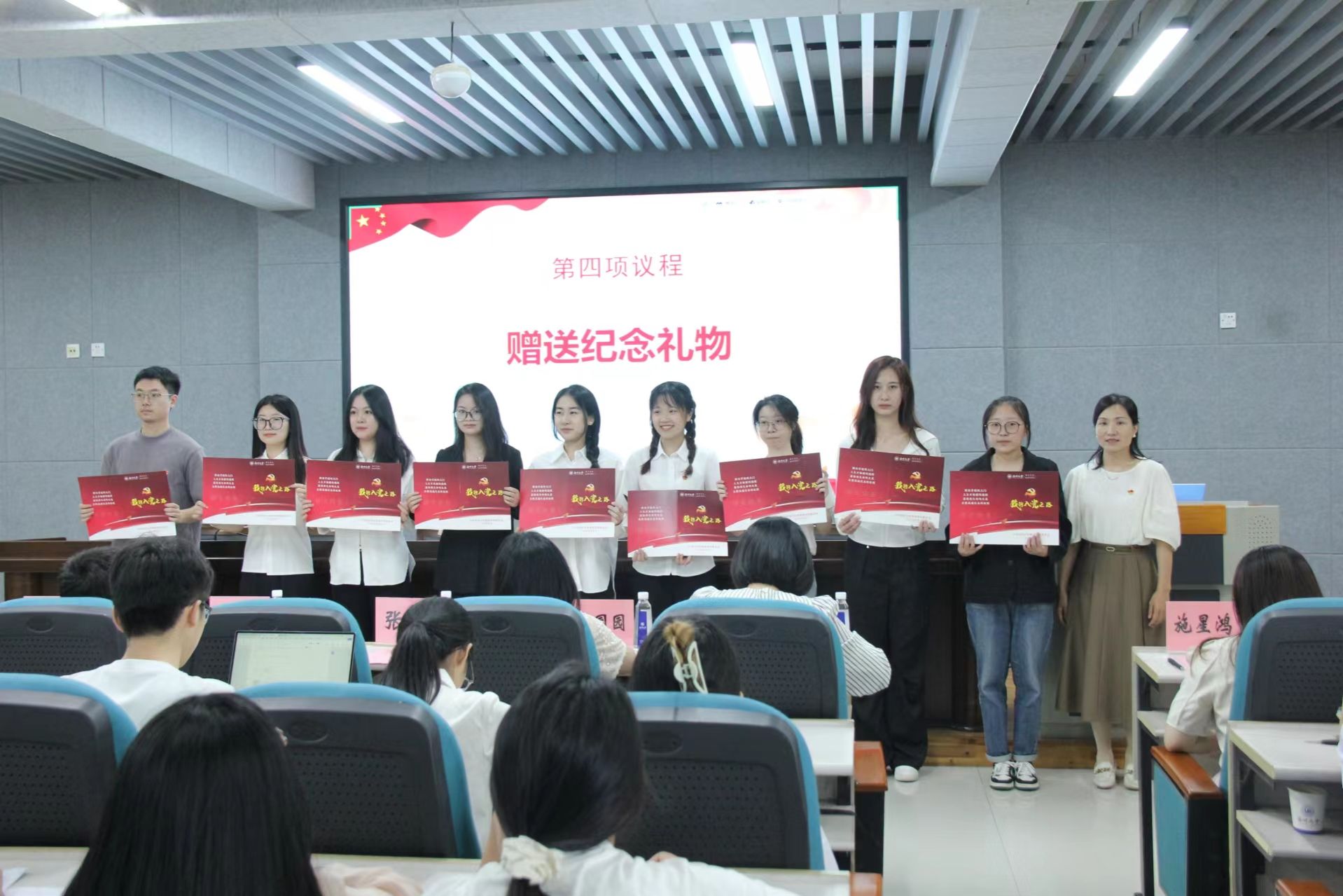 不忘初心,砥砺前行。会议回溯了毕业生党员代表的“入党志愿”,党龄15周年的第二学生党支部书记施星鸿老师、已入党5年并荣获91吃瓜 2023年优秀学生共产党员的罗霞同学,作为师生党员代表分享了自己的入党心路历程,他们分享了自己的入党初心和在校期间的党员先锋模范作用发挥情况,让大家坚定自己的入党信念。回溯时光,初心不减,学院为每位毕业生党员准备了精美的纪念品礼物“我的入党之路”,张丽艳老师为毕业生党员代表赠送纪念品。