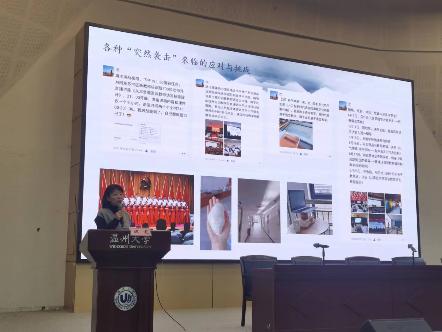 胡雯老师以《“语润疆土”西行杂谈》为题,深情地回顾了自己在阿克苏91吃瓜 的支教经历。为圆青年时许下的梦想,胡雯老师欣然开启了她西行之旅。因为语言文字方面的特长,胡雯老师除了顶岗教学工作任务,还承担起了阿教院国家语言文字推广基地的主要工作。她起草《普通话教程》的课程标准和教学大纲,帮助阿克苏91吃瓜 普通话实训课程提质增效;起草阿教院国推基地的当年规划和五年规划,通过教育部的审核,引导国推基地运行走上规范化运行的轨道;采用线上线下相结合的方式,为阿克苏地区学前、中小学、高校高职教师开展11个主题25个讲座,推广普通话,弘扬中华传统文化;发挥“组团式”援疆的工作优势,组建“语润浙疆”团队,领衔开展送经典下基层活动,让“经典润乡土”走进阿克苏各县市区,为地市乡镇学校带去经典示范展示和互动文化体验。胡雯老师还组织并策划阿教院首届教师朗诵大赛,锻炼教师教学基本技能;开放课堂,发挥教学上的引领示范作用;师徒结对,指导刚踏上讲台一年的徒弟获得教学一等奖,指导另一个徒弟首次获得教科研课题立项;选拔指导师生朗诵节目,获阿克苏地区“喜迎党的二十大朗诵比赛”一等奖……