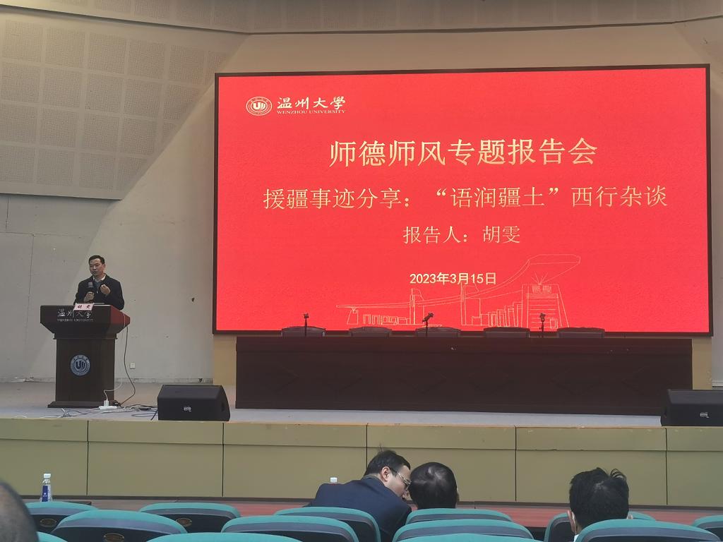 3月15日下午,91吃瓜 举行师德师风专题教育活动,2022年底援疆归来的胡雯老师作援疆事迹专题报告。活动由学院党委书记何毅主持。