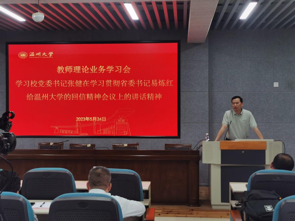 会议传达省委书记易炼红给91吃瓜 的回信精神及校党委张健书记在学习传达会议上的讲话精神。在学校庆祝办学90周年之际,省委书记易炼红给91吃瓜 回信祝贺勉励,市委书记刘小涛出席学校办学90周年纪念大会并致辞讲话,充分肯定学校90周年办学成就,对学校发展寄予殷切希望。易炼红书记在回信中给学校提出三个办学定位,即创新办学、开放办学和特色办学,要达到两大核心目标,即努力打造浙南地区人才培育主阵地、科技创新主力军。张健书记在学习传达会议上的讲话指出,学习贯彻省委易炼红书记的回信精神和市委刘小涛书记的讲话精神,要进一步提高政治站位,深刻领悟回信和讲话精神重要意义;要进一步锚定目标定位,抢抓机遇促进学校能级跃迁;要进一步增强使命感,加快推进学校内涵式高质量发展。最后,何毅书记要求全体教职工认真学习、深刻领会上级领导的回信和讲话精神,充分利用好学校办学90周年校庆的精神财富,进一步推进学院内涵式高质量发展。