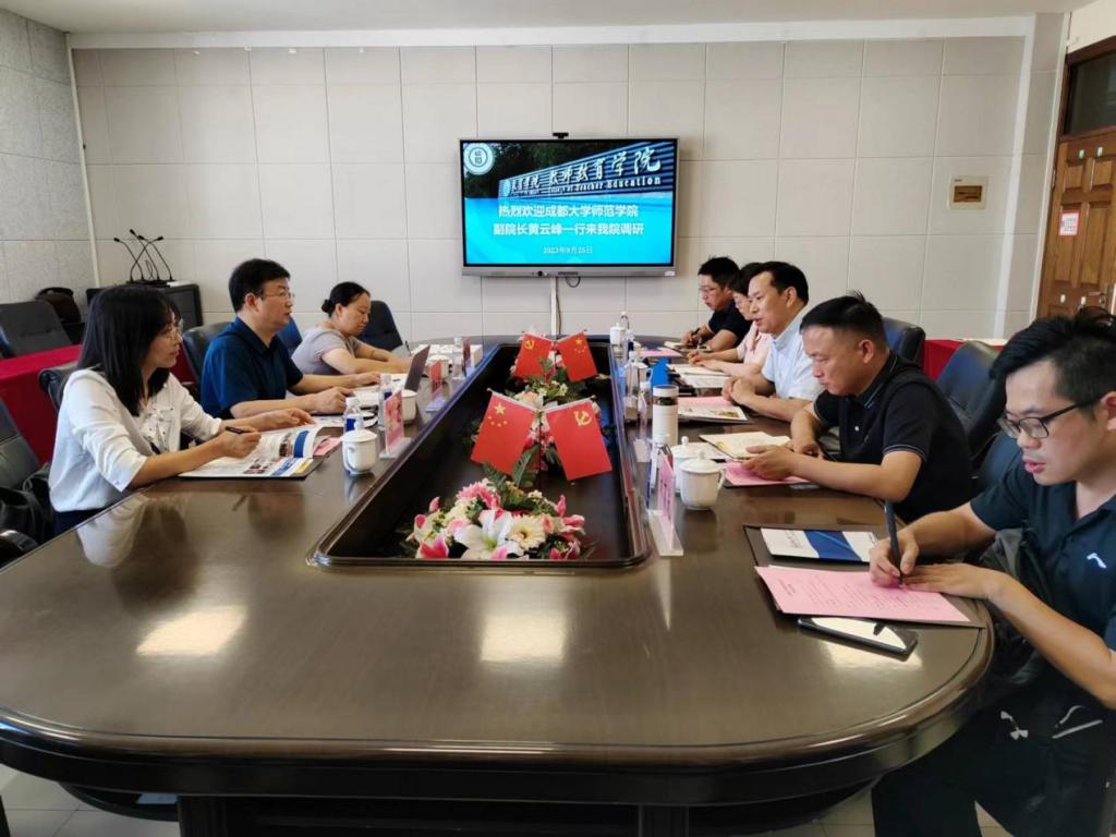 2023年9月25日上午,成都大学师范学院黄云峰副院长一行三人来91吃瓜 调研交流。学院党委书记何毅、副院长叶新东及相关老师参加座谈交流会。