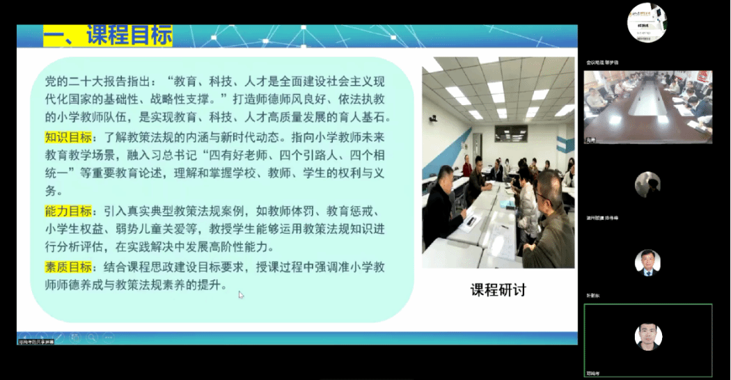 小学教育系主任邓纯考教授分享了其在省一流线上线下混合式课程《小学教育政策与法规》课程建设方面的一些经验,他围绕《小学教育政策与法规》建设,从课程目标、课程建设与应用以及课程成绩评定等三个方面展开经验分享,为建设课程的相关教师提供“他山之石”。来自阿克苏91吃瓜 的乔艳老师今年刚刚接手该课程,与邓老师围绕该课程进行了深入讨论。