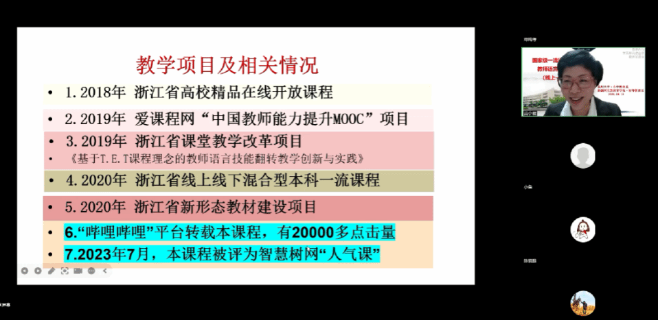 小学教育系吕小君副教授展示了省一流课程《教师语言与沟通艺术》的课程建设情况,该门课程在智慧树平台获得好评。她从课程建设的目标、定位、平台以及课程建设中遇到的困难等方面进行介绍,此外,吕老师还具体介绍了本课程内容的六大模块。