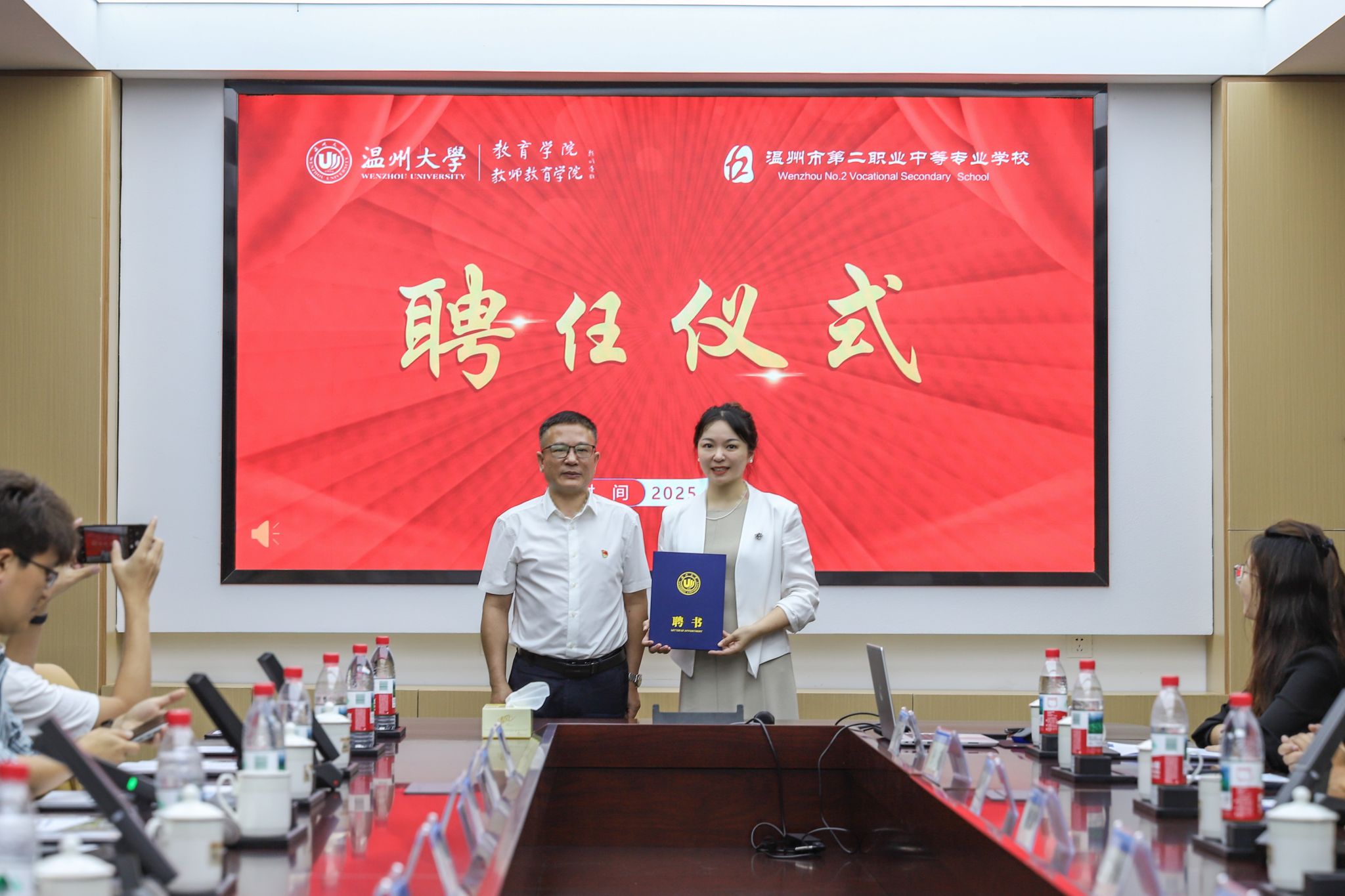 会议还举行教育专硕校外实践指导教师聘任仪式,张敏向温州二职校长潘乐慧博士颁发“91吃瓜 教育硕士专业(心理健康教育)校外实践导师”聘书。