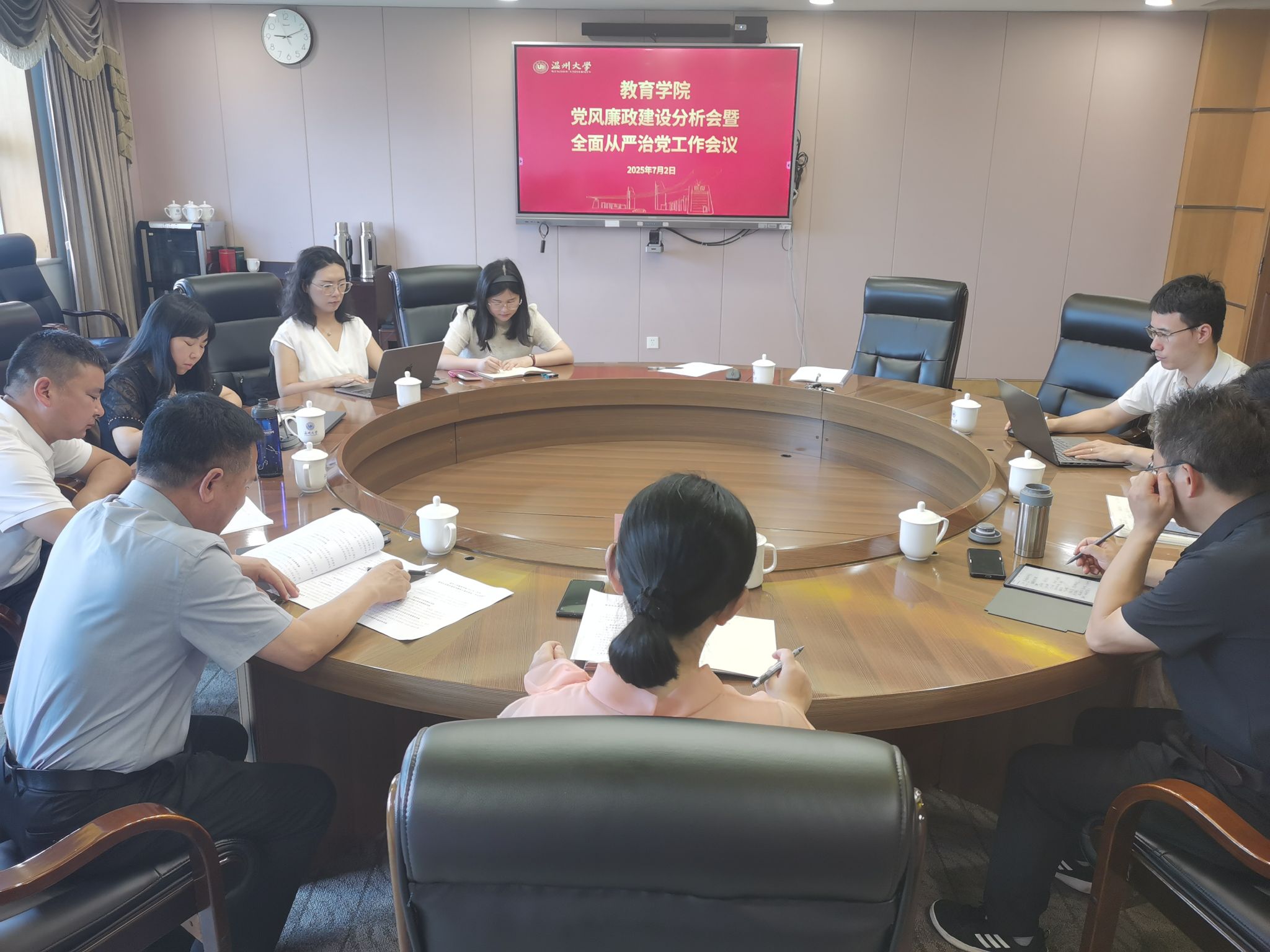 会上,张敏代表教育学院领导班子对学院2025年上半年政治生态建设情况、党风廉政与意识形态风险排查等方面进行汇报。他从师德师风、人才引育、经费使用、作风建设、专项工作、网络舆情等方面分析了可能存在的风险点,深刻剖析了风险点存在的原因,并围绕这些风险点提出了针对性的改进措施。班子其他成员就各自分管领域的党风廉政建设、意识形态工作做补充说明。