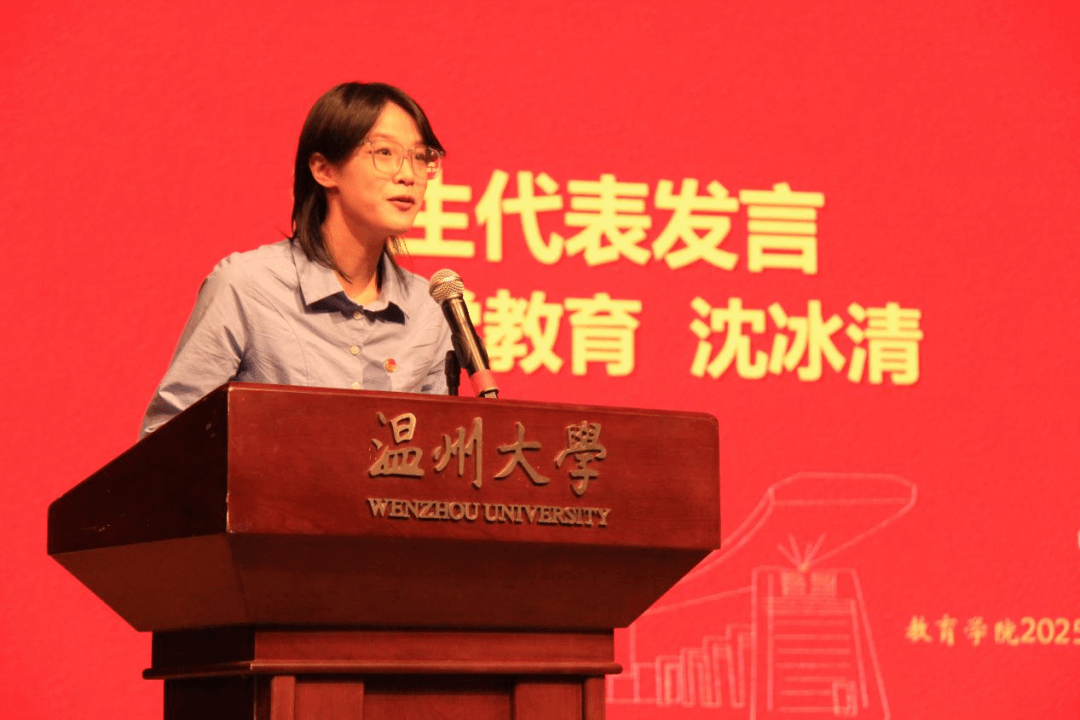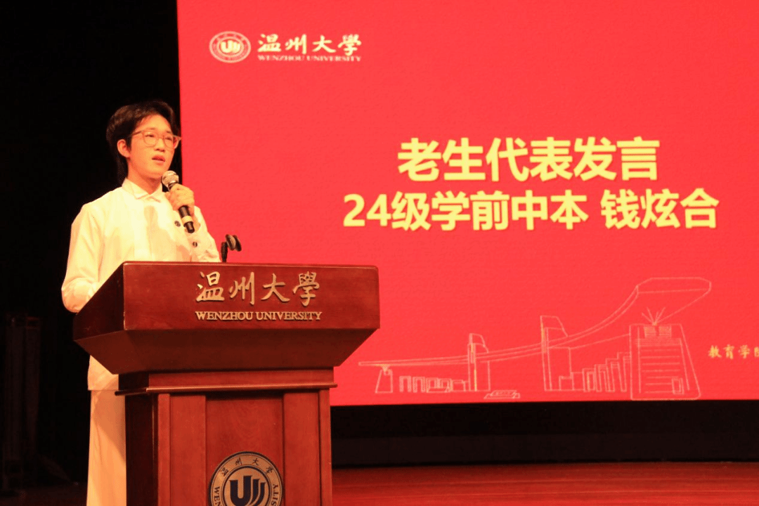 来自24学前中本的老生代表钱炫合同学分享了自己暑期的新西兰访学经历,他通过短视频展示了自己的访学见闻,从学习、文化、专业三视角分享收获,明晰学术与职业规划,并希望在座的新同学们在大学期间收获成长,盼学院建设蒸蒸日上。来自25小学教育的新生代表沈冰清同学表示自己选择教育专业是为了承载使命与梦想,受成长中良师启发后的选择,她表示未来大学四年自己将锤炼教学本领、提升素养,为教育事业贡献青春力量。