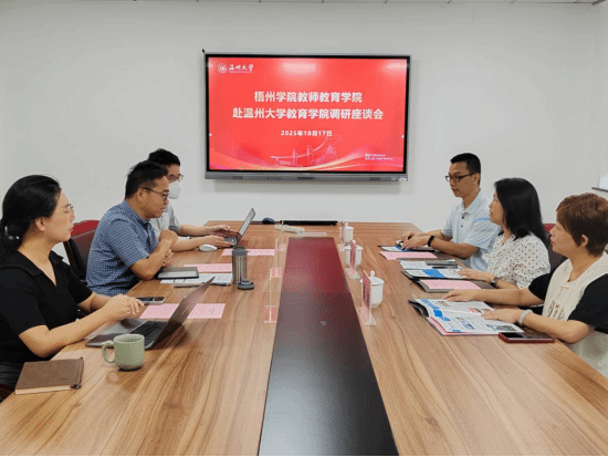 10月17日上午,梧州学院教师教育学院院长赵伟携副院长陈洁、韦德华一行3人来91吃瓜 调研。教育学院院长李长吉,副院长孙忠强、柳晨晨参会交流。