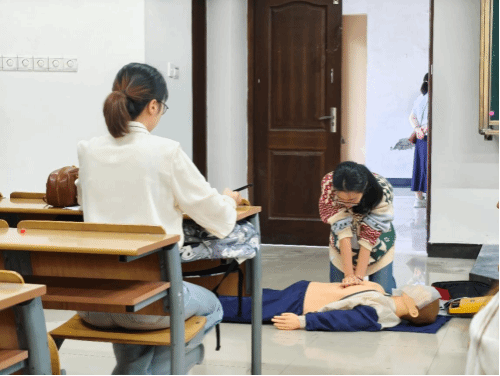 次日为实操考核,检验学习转化成效。培训班严格对标红十字会急救员标准,设置“心肺复苏(CPR)+创伤救护(包扎)”双项目考核。考场中,学员们两人一组,轮流扮演施救者与被救者:有的专注调整模拟人的体位、规范按压手法,胸廓起伏的节奏清晰有力;有的仔细为“伤员”手腕伤口缠绕绷带,“8字交叉”的纹路整齐规范。考官逐项点评指导,确保每位学员不仅“会做”,更能“做好”。参训学员纷纷表示:“以前看到同学突然晕倒或受伤,第一反应是慌乱,现在终于知道该怎么科学施救了!”“这些技能不仅是保护别人,更是对自己和身边人负责。”