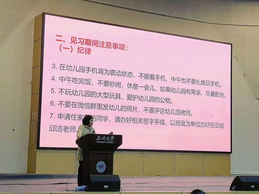 “安全是实践的前提,礼仪是专业的底色。”会议伊始,张晓霞老师以“严守底线、涵养素养”为主题,为学子们敲响警钟、指明方向。她着重强调:见习期间须时刻将安全放在首位,严格遵守幼儿园规章制度,不触碰非法宗教活动等原则红线;同时需注重职业礼仪规范——从着装得体到言行亲切,从与幼儿互动到与家长沟通,每一个细节都代表着未来幼儿教师的职业形象。“你们的举手投足不仅是个人素养的体现,更是温大学子专业精神的缩影。”
