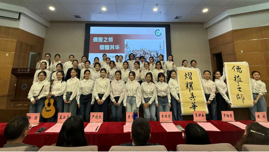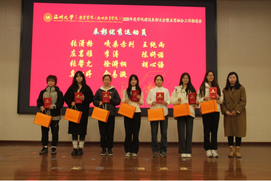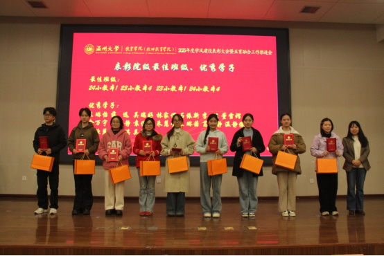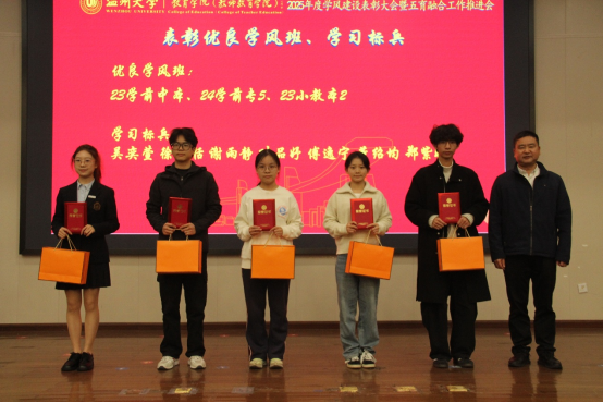 章园园为“最佳班级”“优秀学子”颁奖。校级“优良学风班”23学前中本一体化班级,通过照片与视频回顾六年成长历程:专业学习上,同学们组建“互助小组”攻克学术难题,在期刊发表多篇联合署名论文;艺术实践中,班级原创节目登上校内外舞台,用童趣视角传递教育温度;科研创新中,团队申报的“乡村学前教育帮扶”项目获省级立项,将所学转化为服务社会的行动……班级展示的累累硕果,正是五育融合育人成效的鲜活缩影。