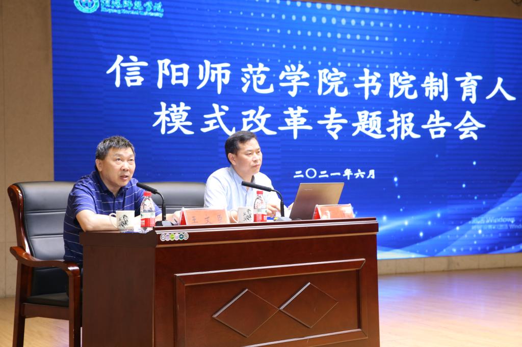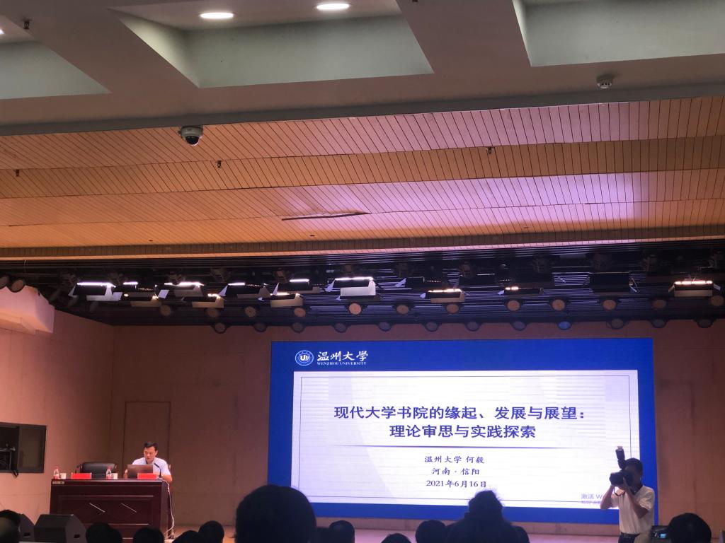 6月16日上午,受信阳师范学院邀请,学院党委书记何毅赴信阳师范学院作了题为《现代大学书院的缘起、发展与展望:理论审思与实践探索》的专题报告。该校党委副书记、工会主席王文臣主持报告会,校领导,全校中层干部,学工部、团委工作人员和全体辅导员参加报告会。