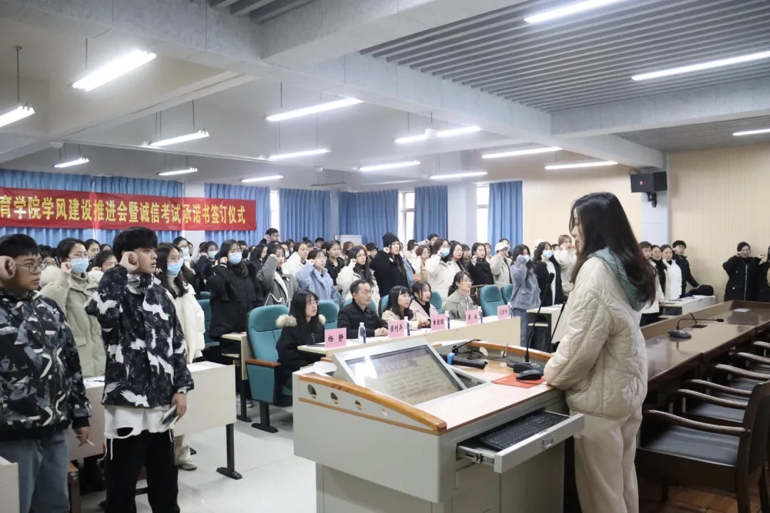 在学生代表余欣媛的带领下,与会学生一同在诚信考试承诺书上签名,并进行郑重宣誓。