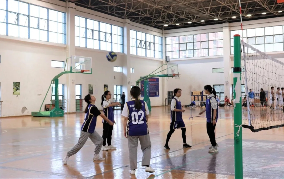 比赛开始前,教院队伍有条不紊地进行传球、进攻练习,共同商量比赛策略。比赛中,教院运动员们配合默契,敏捷跑位、精准拦网、奋力扣杀,一次次漂亮的弧线发球,眼花缭乱的配合传球和精彩的大力扣杀球使比赛现场氛围火热。传递之间,排球辗转于一双双相似却不近同的手上,投掷空中,牵动在场所有人的心弦,只等落地,场内外爆发出一阵阵激烈的欢呼声。各参赛队伍奋勇争先,队员之间互相鼓励,一幕幕热血的画面定格在相机内,充分展现了教院学子的团队意识与竞技精神。