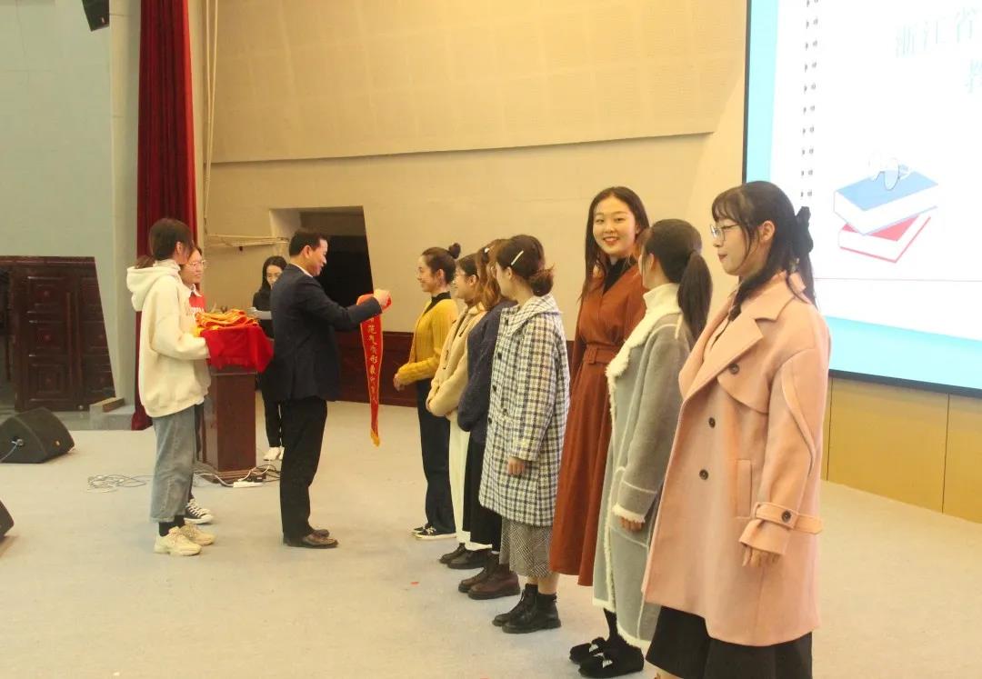 会议伊始,主持人介绍了本次师范技能竞赛中91吃瓜 学子取得的优异成绩,并请何毅书记上台为七位获奖选手授予绶带和聘书、颁发纪念品,聘请她们担任教院“师范气质形象代言人”。