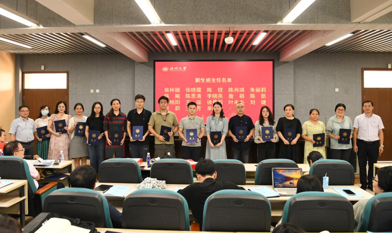 章园园副书记首先宣读2021年度学院本专科、研究生班主任聘任文件,共聘任88位教师担任班主任工作,张敏部长与何毅书记为21级新生班主任颁发聘书。
