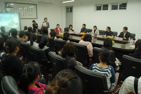 胡来林院长首先向大家简单介绍了学院基本概况和发展愿景,使同学们对学院有更深入的了解。之后,师生双方开始互动问答。有的同学提出:教育统计学和小学心理学这两门课学得比较困难,中间应该增加有铺垫作用的学科,比如普通心理学;有的同学提出:毕业班前段时间课少,大家都很闲,后段时间实习又很忙,而且听课的课时因为去的时间较迟就变少了,希望学院能安排妥当一点;有的同学提出:勤工助学打扫教室的部分同学责任心不强,导致教室很脏……各种涉及学院基础设施建设、人才培养方案设定、学科建设,以及同学们平时在学习、生活上存在的问题得到了较好的反映,对此,学院领导和相关老师本着“能自己解决就及时解决、不能自己解决及时向有关部门及时反映”的原则,对大家的提问一一登记、解答,获得了学生代表的热烈掌声。