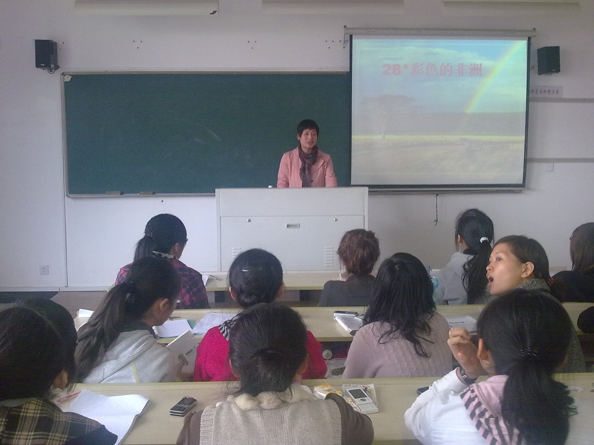 接下来,缪老师又从技能目标、认知目标和情感目标分析了《彩色的非洲》的教法,并指出略读课文的教学特点----关键在于如何做好课后的拓展。缪老师指出略读课文要用多样的教学方法来拓展学生的知识面,而不是单词的认识和课文的解析。缪老师采用PPT,诗歌化的朗读和课文转换再加上对比法,把一堂本无新意的高年级略读课上地形象生动,气氛浓烈。