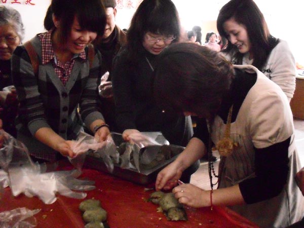 宁静的军分区在志愿者到来之后变得热闹起来,大家忙不迭的洗手戴手套,积极投入到包清明果子的队伍当中。男生们和老人一起揉面团,女生们则在老人的指导下,有模有样的包起清明果子来,不一会儿,成形的清明果子就被送入了蒸笼当中。