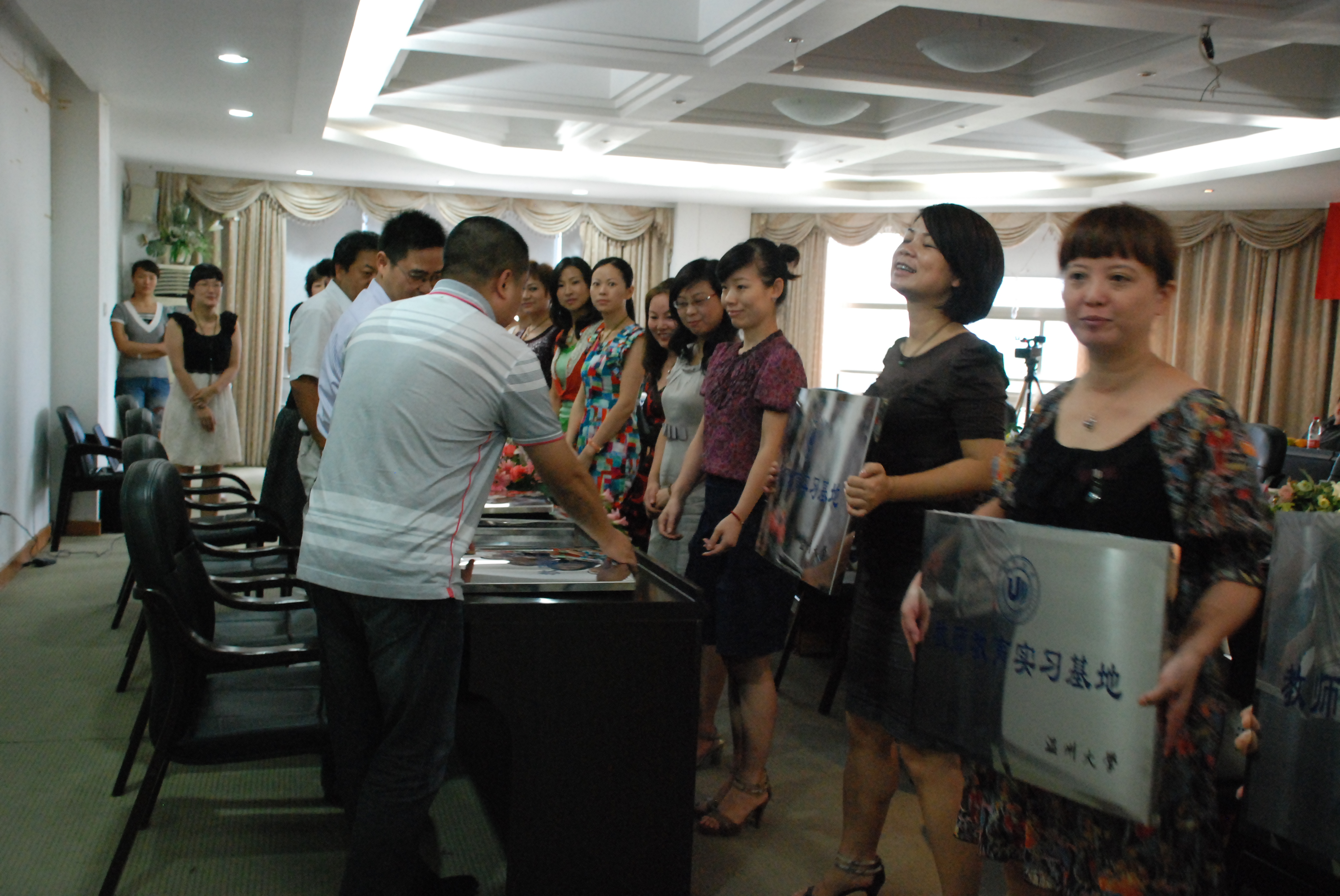 签约授牌仪式在隆重热烈的气氛中举行,胡来林院长、周文林副局长、方乐平副处长和张新立副处长共同为14所幼儿园园长授牌。