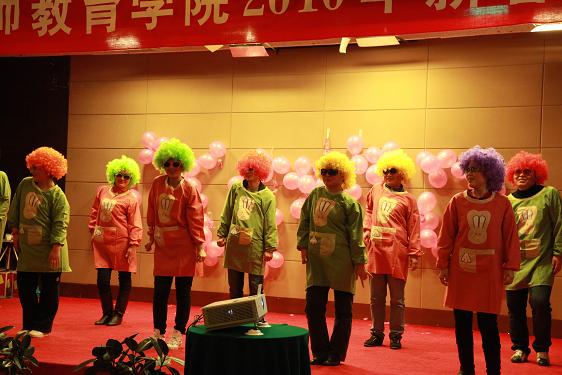 在联欢会开始前,所有到场的教职工一起来到酒店外进行“系红领巾”的游戏,每个部门各出8名教师结组参赛,活动现场既紧张激烈,又轻松搞笑,比赛高潮要算实验教学中心和小学教育系的终极PK,最终由实验中心夺得了比赛的冠军。