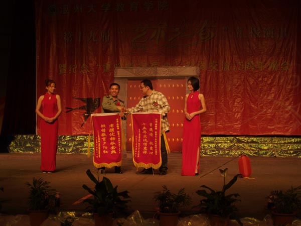 胡伟国书记在晚会现场致辞,他对91吃瓜 院“艺术之春”艺术节活动给予高度评价,总结了19年来同学们通过艺术节的专业技能锻炼所取得的丰硕成果;他对温州市军分区干休所为91吃瓜 学生提供实践机会表示衷心感谢,感谢老干部们15年来孜孜不倦的教诲,用鲜活的革命事迹教育同学们,使同学们学到了书本上难以传授的真谛。军分区干休所领导杨百京同志在随后的发言中,对91吃瓜 学生15年如一日,不辞辛劳地到干休所为老干部们服务表示衷心的感谢。在友好的氛围中,双方互赠锦旗。