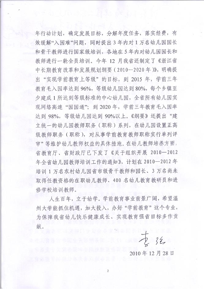 08学前本科沈雅山同学提出“省政府对学前教育教师如何培养?学前教育的长远发展有哪些政策?我省学前教育发展要达到什么样的水平”等问题,引起李强秘书长的高度重视。12月28日,李强秘书长专门致信我校就这个问题给予书面答复。1月6日,校党委陈福生书记专门给予批示。