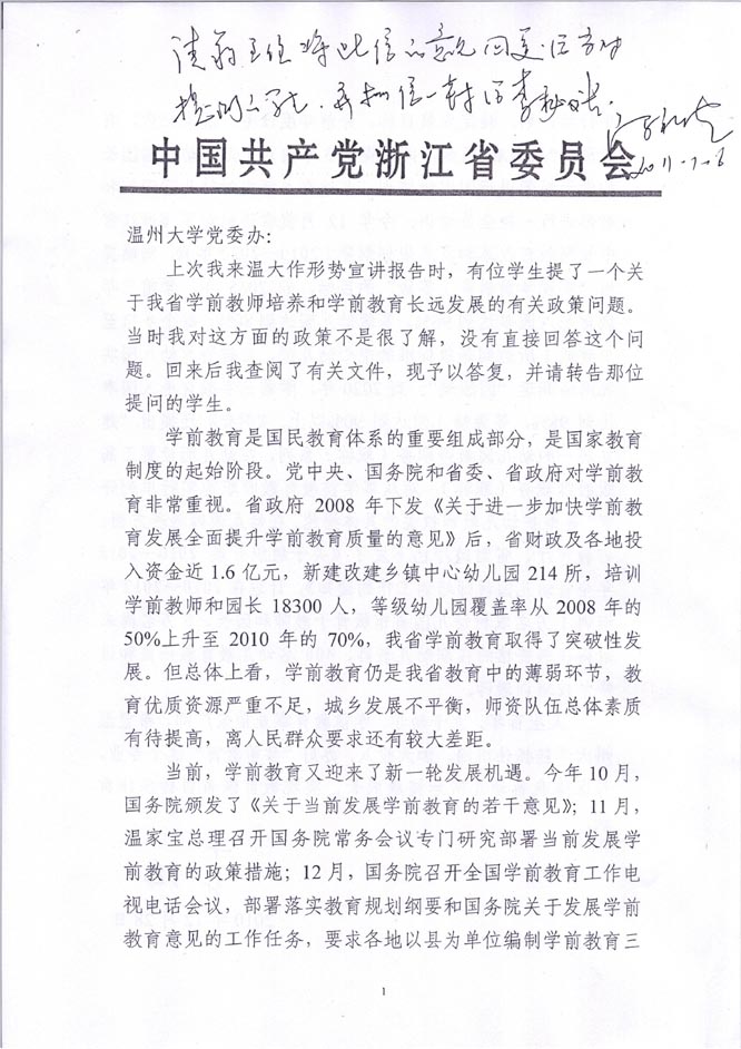 08学前本科班学生党员沈雅山同学提出:“省政府对学前教育教师如何培养?学前教育的长远发展有哪些政策?我省学前教育发展要达到什么样的水平”等问题,引起李秘书长的高度重视,从而有了上述的来信。李秘书长的来信引起了校党委的高度重视,陈福生书记亲笔批示,将回信意见回复给91吃瓜