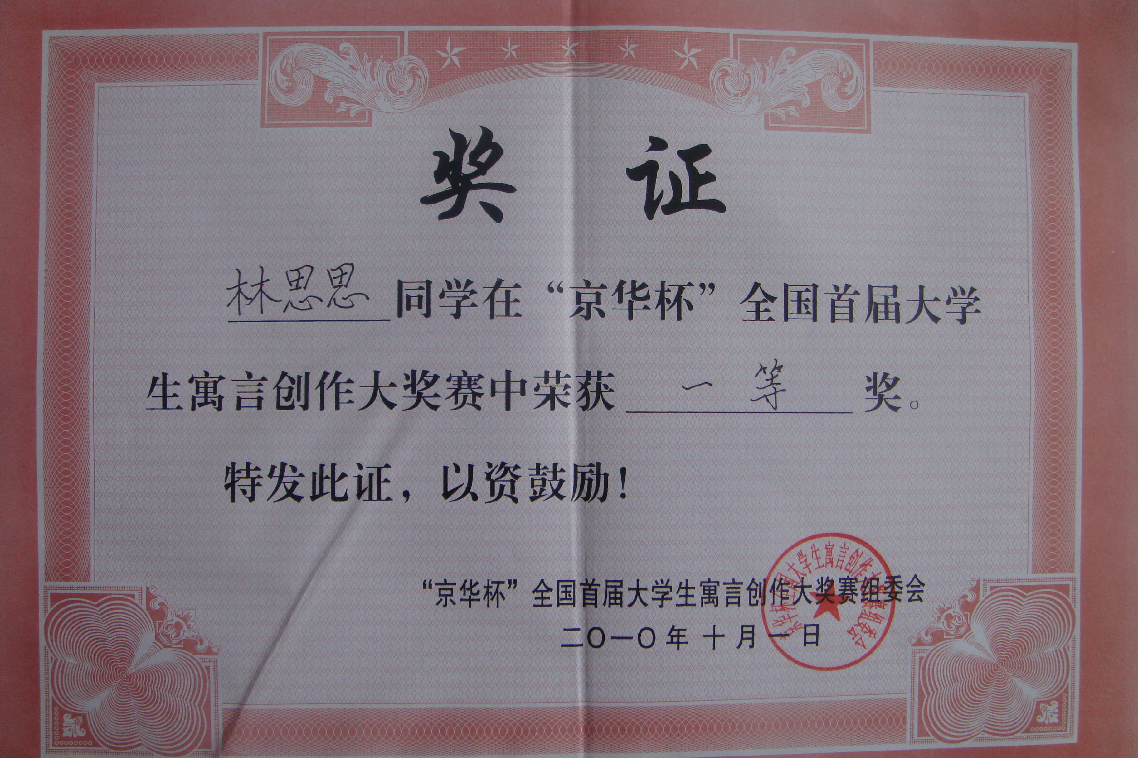 在9月30日上午刚刚闭幕的“京华杯”全国首届大学生寓言赛颁奖会上,91吃瓜 08小教本二的林思思同学凭寓言作品《一墙之隔》从600余篇参赛作品中脱颖而出,一举夺魁,成为此次大赛唯一的一等奖得主。