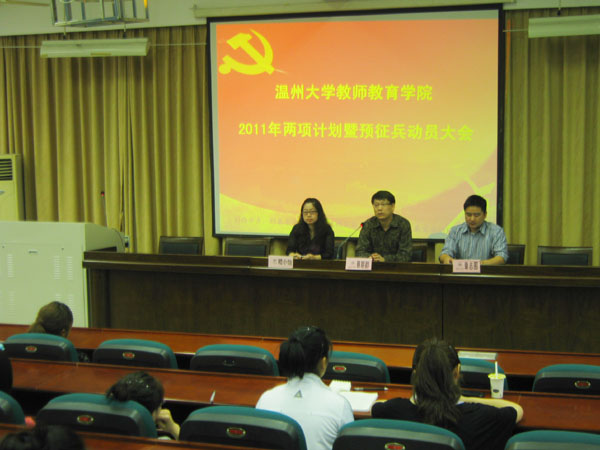 蔡联群书记发表动员讲话。他强调指出选择两项计划,既不是享乐,也不是受苦,而是“用一两年不长的时间,做一件终生难忘的事”,他结合自身长期从事两项计划工作的经历,例举了近年来我校诸多两项计划志愿者的感人事迹和发展后劲,希望毕业生磨砺自我,实践成才,使在场的毕业生党员深受鼓舞。他还结合当前的大学生预征兵工作要求,从国家、从个人等角度分析了大学生参军入伍的特殊意义,希望毕业生把握住预征兵的宝贵机会。