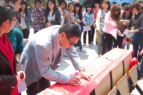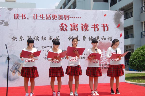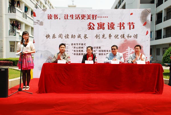 举办为期1个月的以“快乐阅读助成长,创先争优促和谐”为主题开展公寓读书节活动。4月21日中午,公寓读书节开幕式在公寓C区隆重举行。学生处处长王定福、院党总支副书记嵇小怡、院学生科长章志图、学生处老师涂立广及各学院辅导员老师出席了开幕式。上百名学生参加了开幕式。