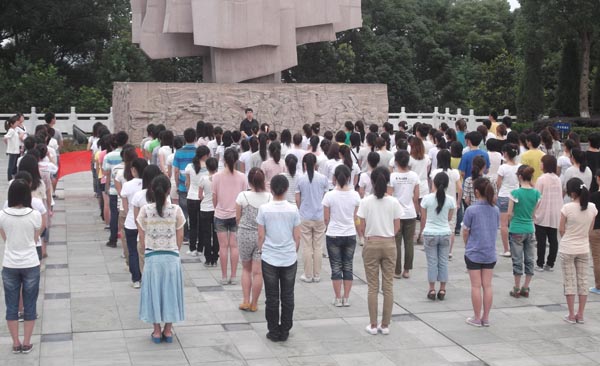 在巍峨庄严的人民英雄纪念碑前,新党员们怀着敬崇感恩的心情,为革命烈士敬献鲜花并默哀。在雄壮激昂的《国际歌》曲声后,全体新党员在组织委员