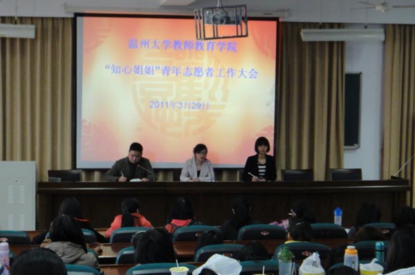 “知心姐姐”青年志愿者工作大会在北校3-101教室召开,党总支副书记嵇小怡、学生科长章志图、辅导员李薇老师出席会议,全院近百名“知心姐姐”志愿者参加会议。
