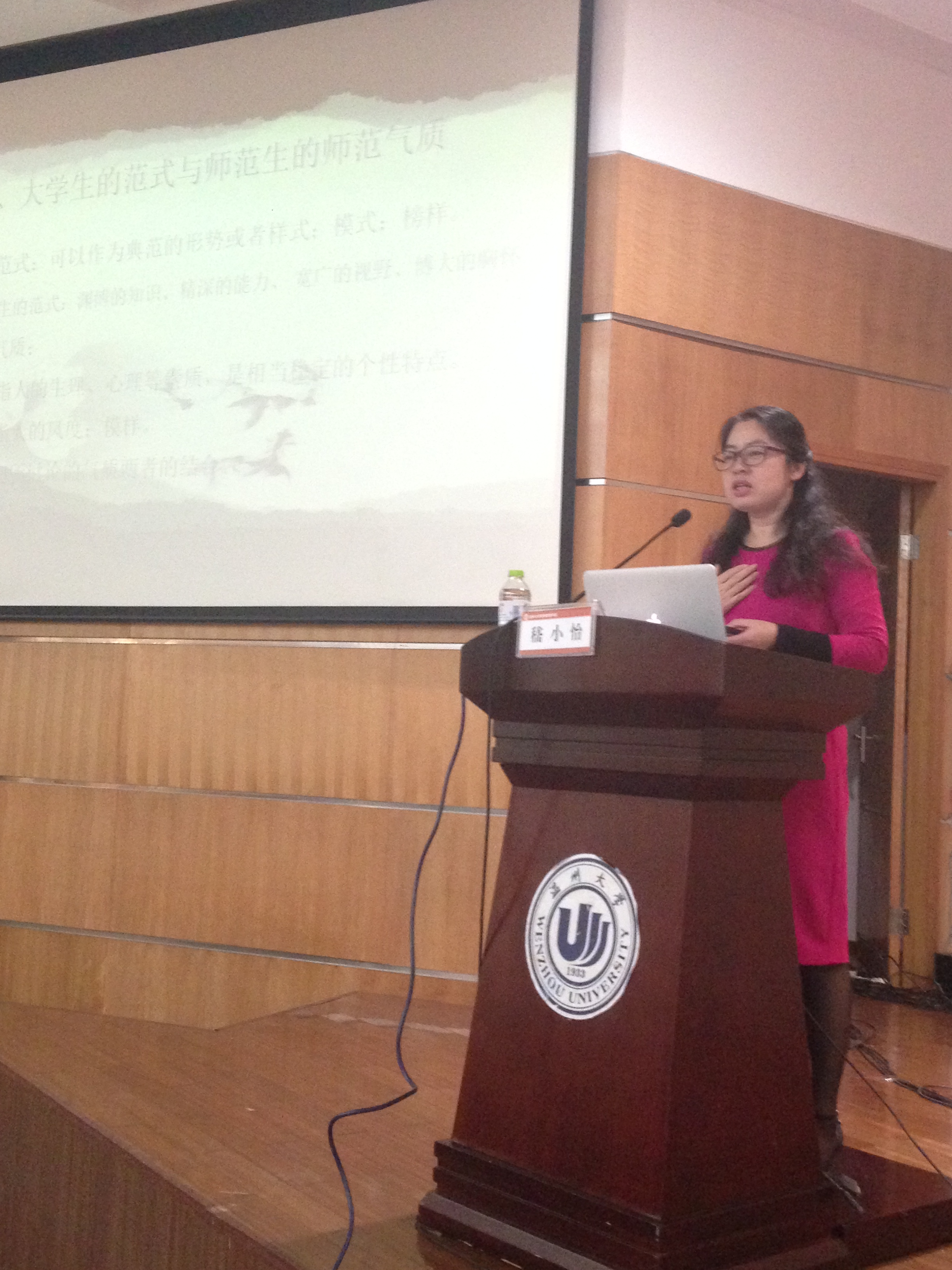 学院党总支副书记嵇小怡老师为在座的师生带来微讲座“美丽青春行、幸福教师梦——师范气质之自我修炼”。嵇老师指出,气质是一个人从内到外的一种内在的人格魅力,是长久的内在修养平衡以及文化修养的一种结合,是持之以恒的结果。而我们师范生特有的“师范气质”就是我们在专业教育与培训基础上形成的,明显而又独特的教师专业素养和职业倾向性的外在显现。作为一名师范生,我们要努力提升自身的内在修养和文化修养,专研性地学习专业知识,适当性地选择干部历练,选择性地参加社会活动,坚持性地训练师范技能,不断性地阅读各类书籍,用知识武装自己,用运动磨练自己。最后,嵇老师对我们提出了以下期望:塑造师范气质,实践美丽青春行;展现教师风采,实现幸福教师梦!嵇老师慷慨激昂、热情洋溢的号召赢得了在场同学们一片掌声。