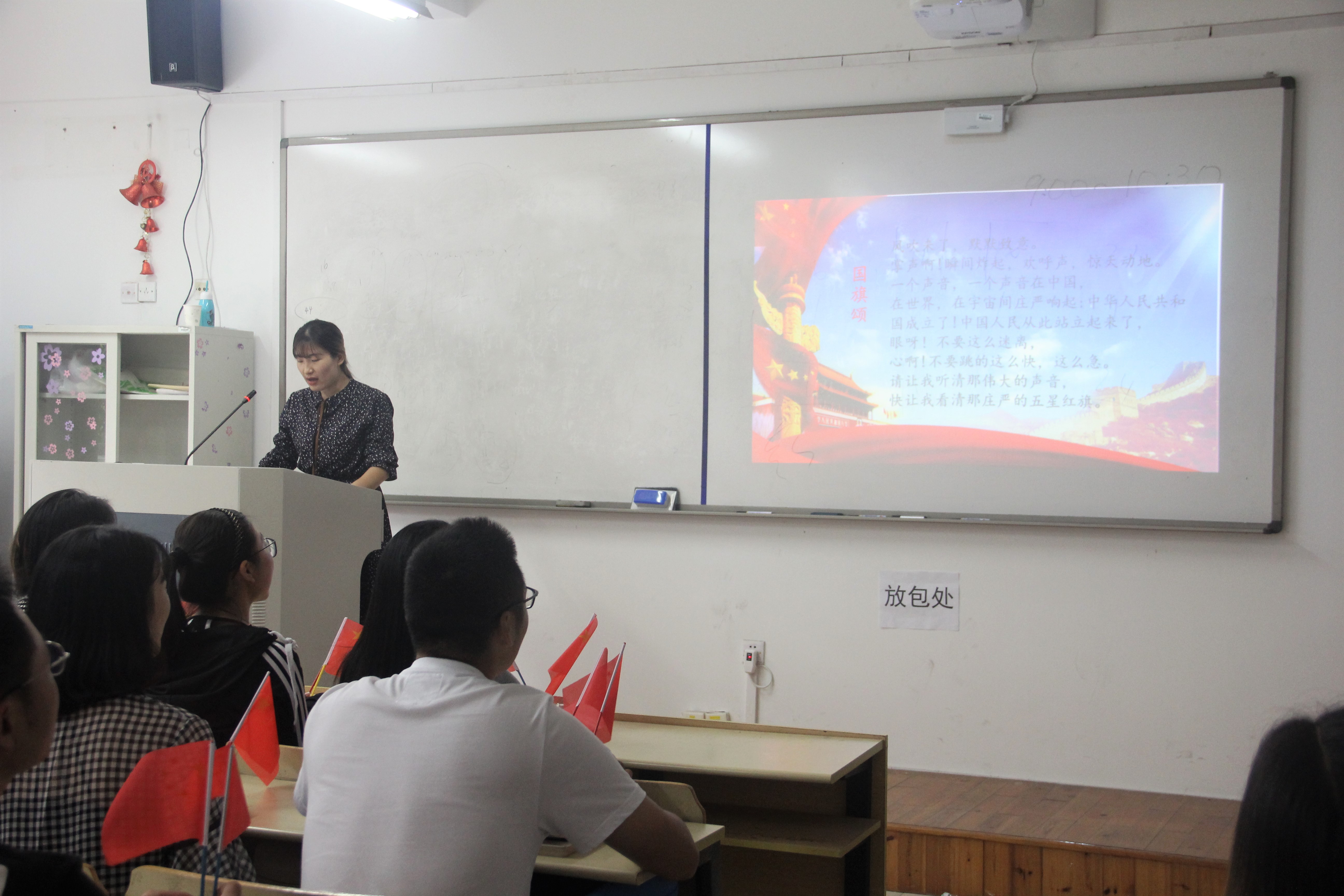 大家被国旗背后的故事所感动所震撼,原来一面五星红旗下有些这样一个与众不同的故事。在感动的同时,大家接着诵读了《国旗颂》,每个人都精神饱满、举止大方,一句句慷慨激昂的诗歌,每一句都抒发着对祖国的热爱和美好未来的祝愿。